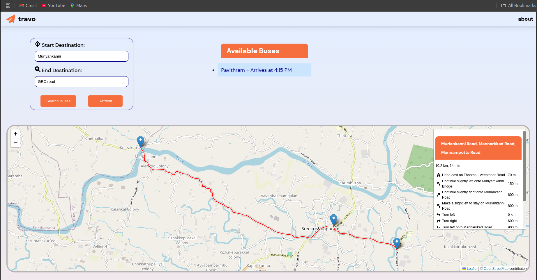 Developed a Bus Route Tracker System with Javascript, HTML, CSS, and JSON, featuring bus details, bus route map, and bus timings in order. Deployed on Netlify, the system find and display ongoing bus route and details based on user input.